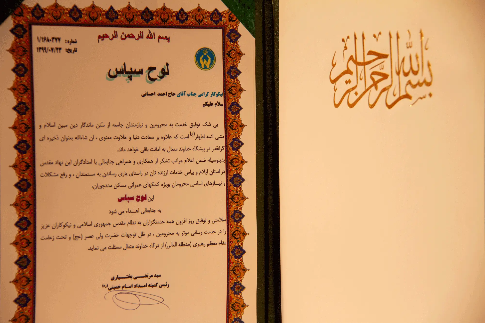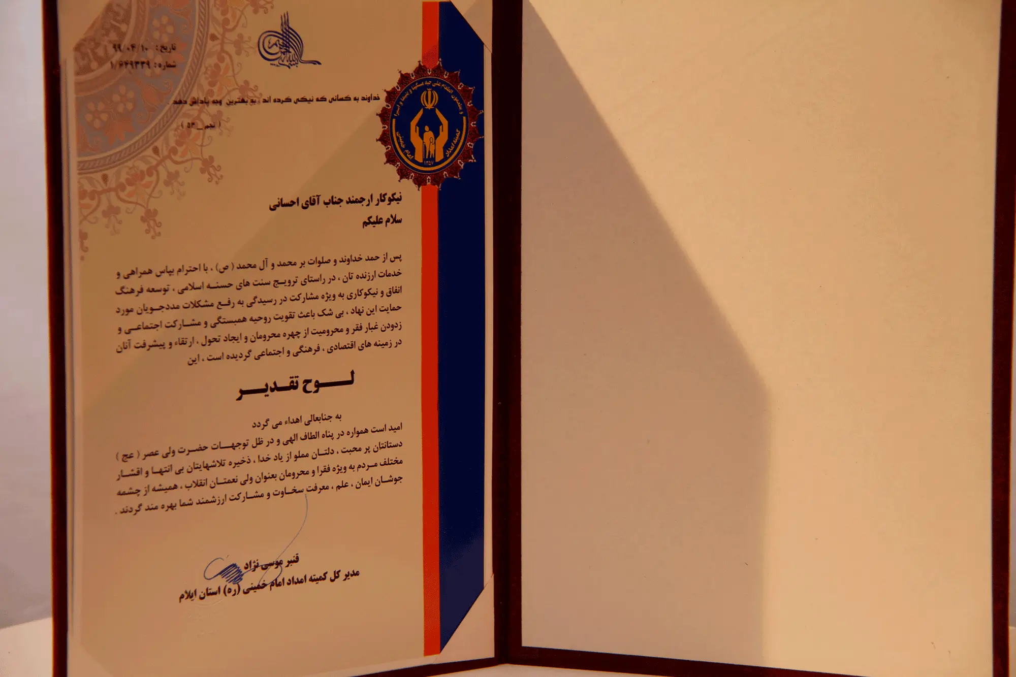 قدّمت لجنة الإمداد للإمام الخميني (قدّس سره) في محافظة إيلام هذه اللوحة تقديراً للخدمات القيمة وللجهود المستمرة في دعم الأسر المتعففة وتمكين الفئات المحرومة في المجتمع.