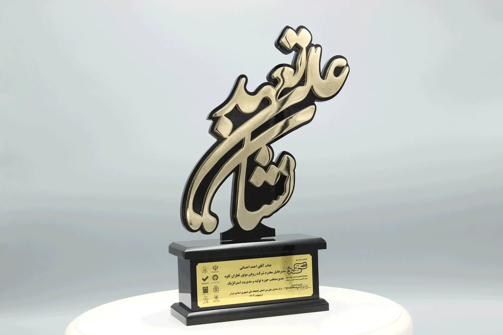 وقد مُنحت هذه اللوحة تقديراً لاختيار هذه الشركة كوحدة صناعية نموذجية لعام ۱۴۰۱ هجري شمسي.