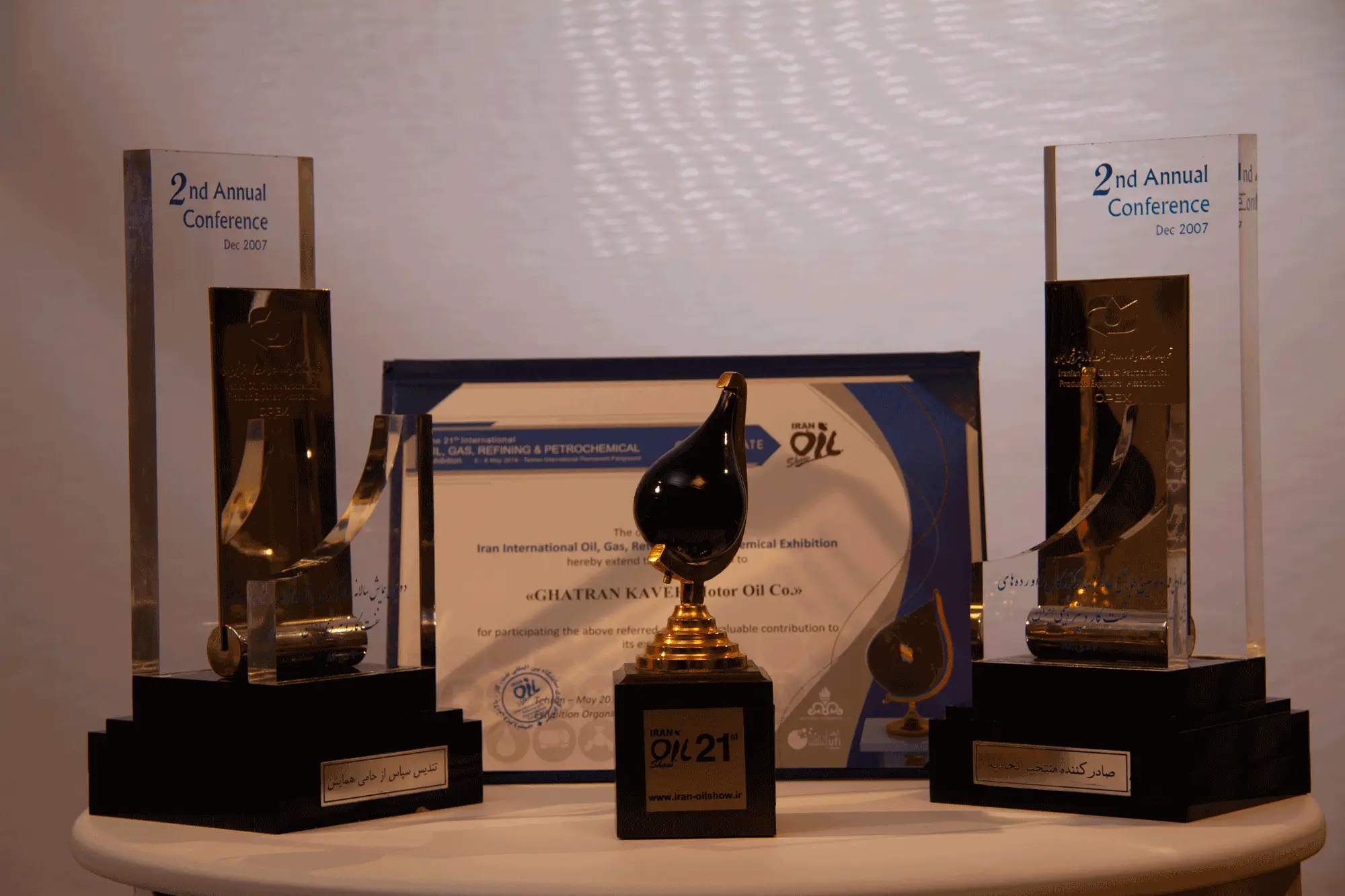 This set includes two trophies from the Second Annual Conference (2007) and a trophy with a certificate of appreciation from the 21st Iran International Exhibition of Oil, Gas, Refining, and Petrochemicals, awarded in recognition of the company’s active presence and valuable participation in this prestigious international event.