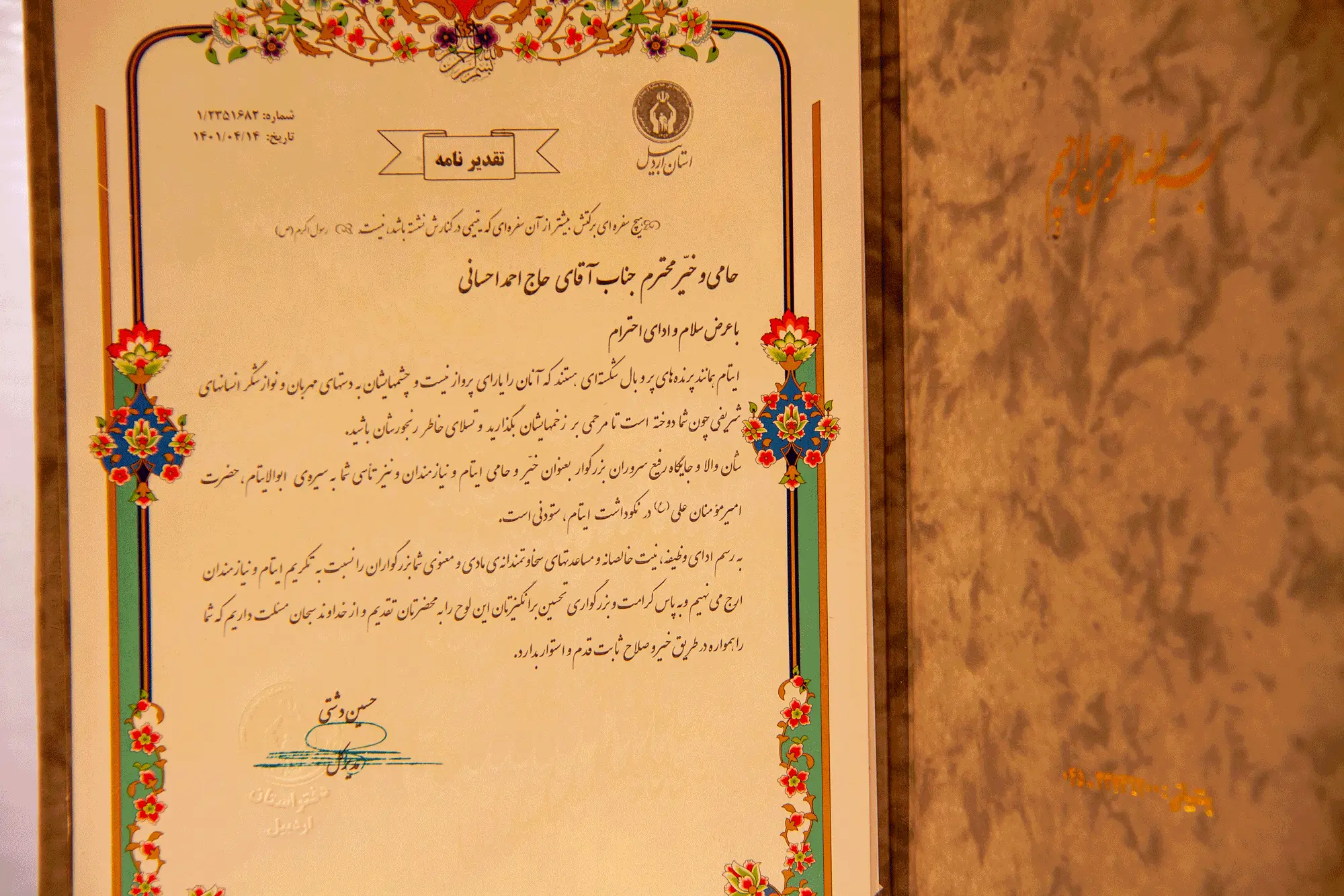 This plaque of appreciation has been awarded by the respected authorities of Markazi Province in recognition of Mr. Ehsani’s valuable contributions and lasting support in the fields of healthcare, assistance to patients, aid to the needy, and participation in charitable initiatives.