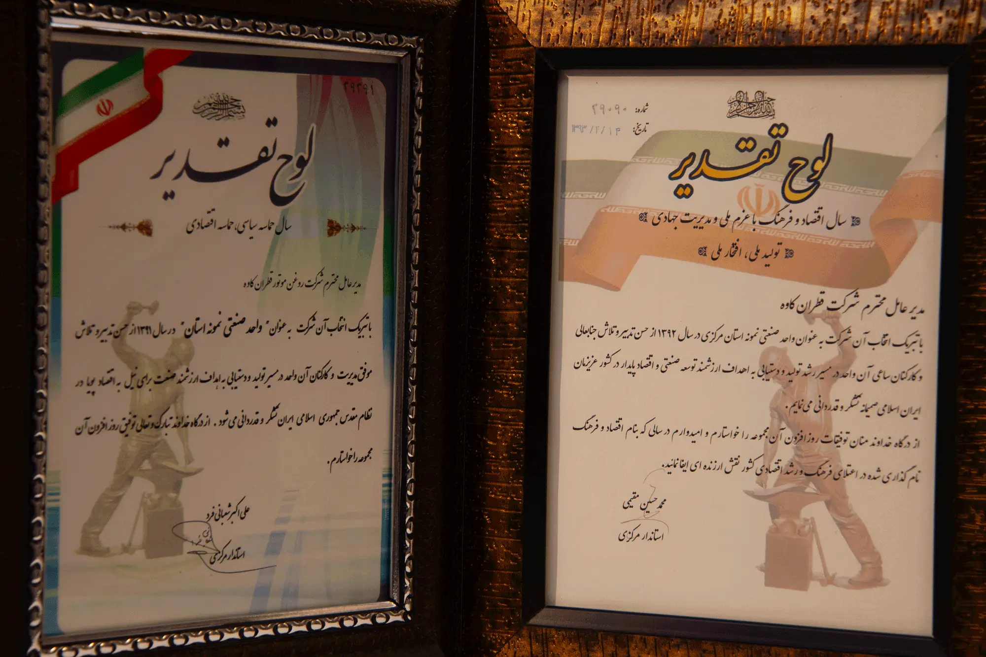 Cette plaque officielle de reconnaissance et d’appréciation a été décernée par le Gouvernorat de la province du Markazi et par l’Organisation de l’Industrie, des Mines et du Commerce de la même province.