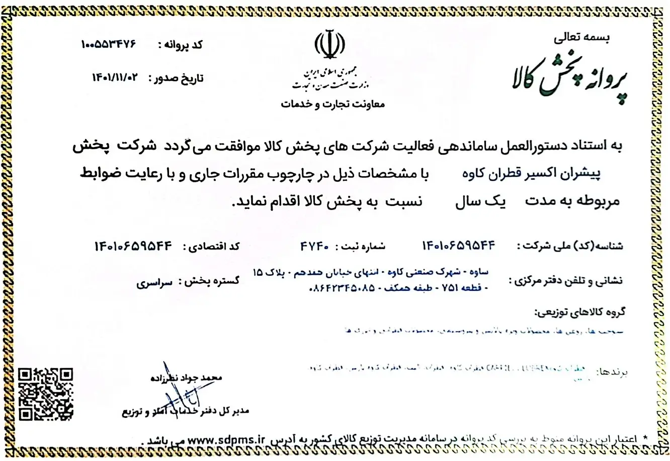 La société Pishran Exir Qatran Kaveh détient une licence officielle de distribution de marchandises délivrée par le ministère de l’Industrie, des Mines et du Commerce. Elle est autorisée à exercer des activités dans le domaine de la distribution et de la vente de marchandises à travers tout le pays sous le numéro de licence 100553476. Cette licence a été émise conformément aux réglementations en vigueur et est valable pour une période d’un an à compter du 1401/11/02. Le siège social de la société est situé dans la Ville Industrielle de Kaveh, Saveh, et son groupe de produits distribués opère au niveau national.